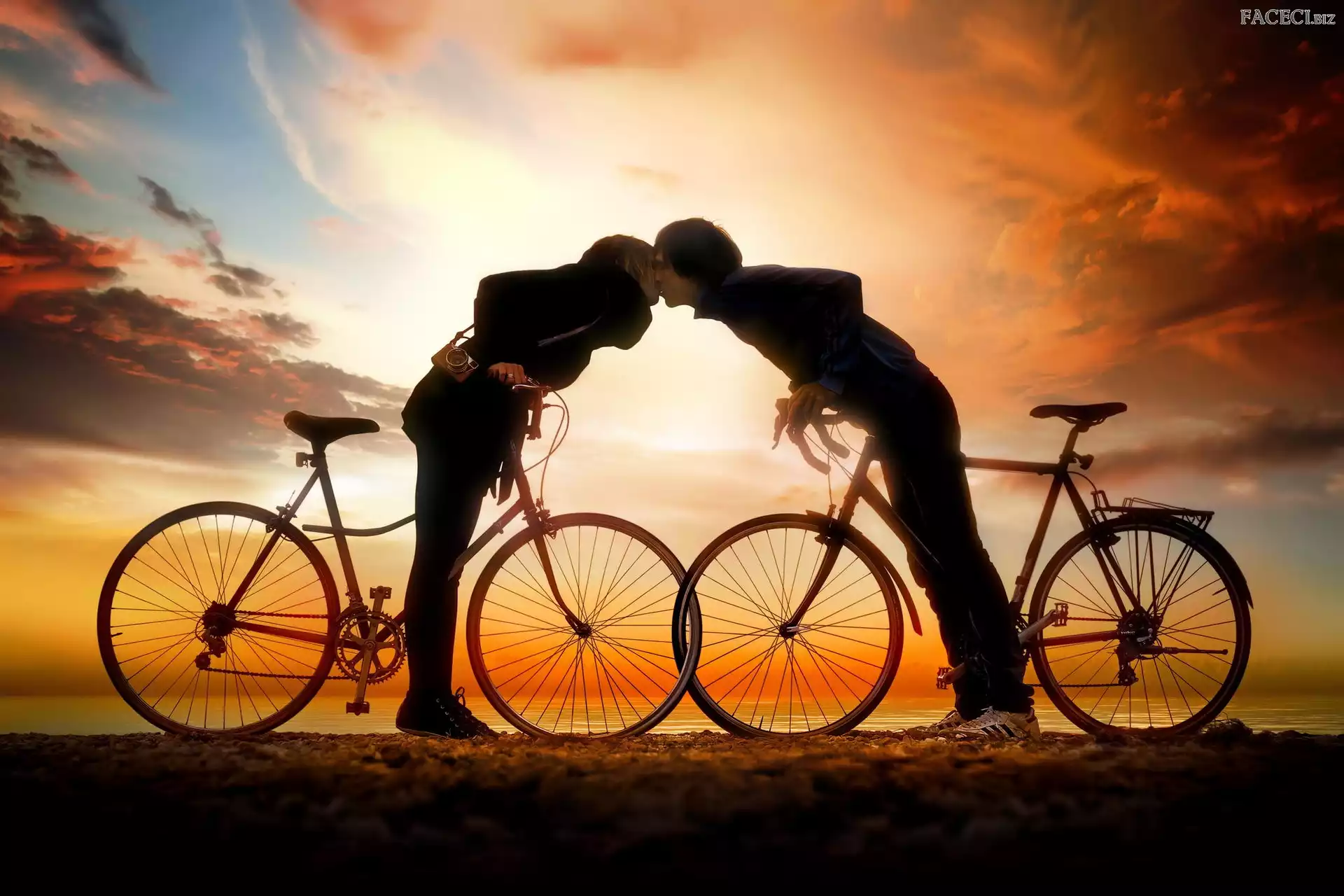 Pocałunek, Słońca, Rowery, Para, Zachód - faceci.biz